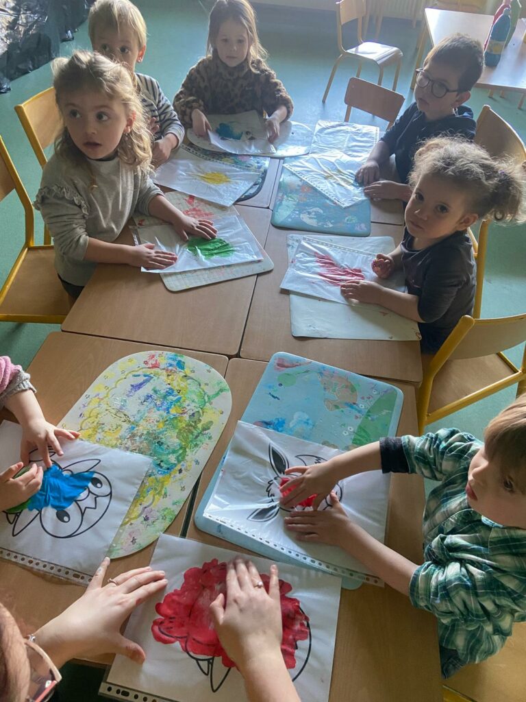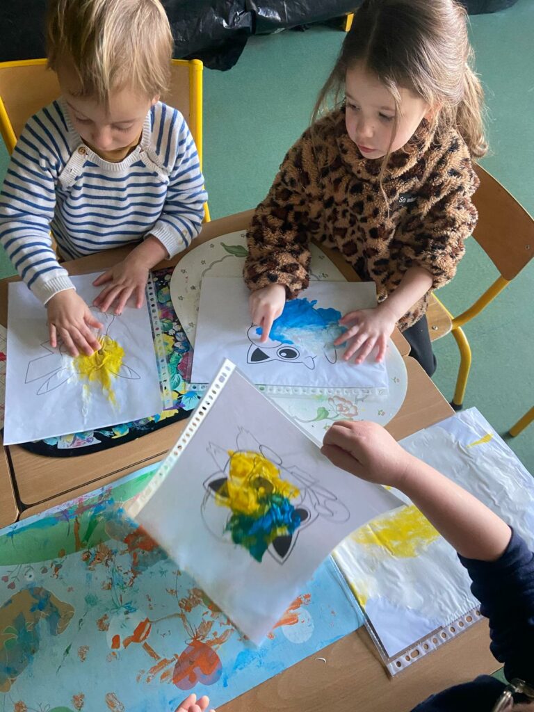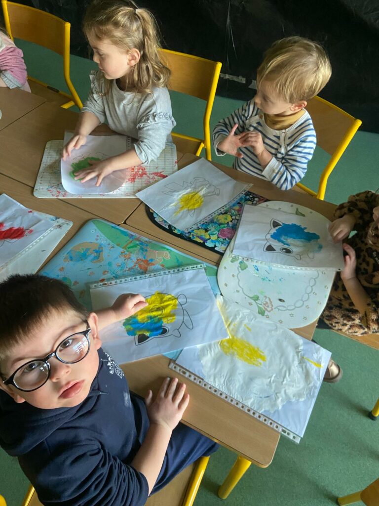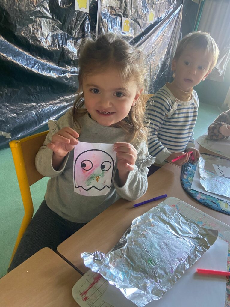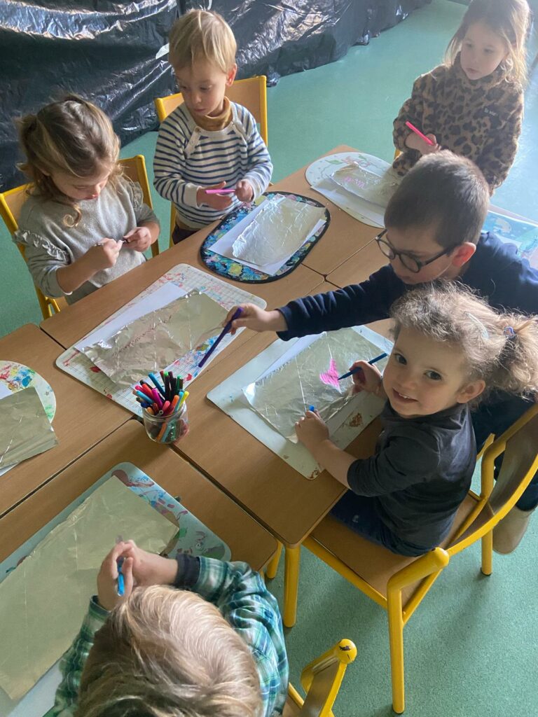 Aujourd’hui, les plus petits ont commencé par des jeux de connaissances, puis ont enchaîné sur le rituel réveil dynamique avec de la danse. Ils ont expérimenté de la « peinture propre » ainsi que de la peinture magique grâce à du papier d’alluminium.